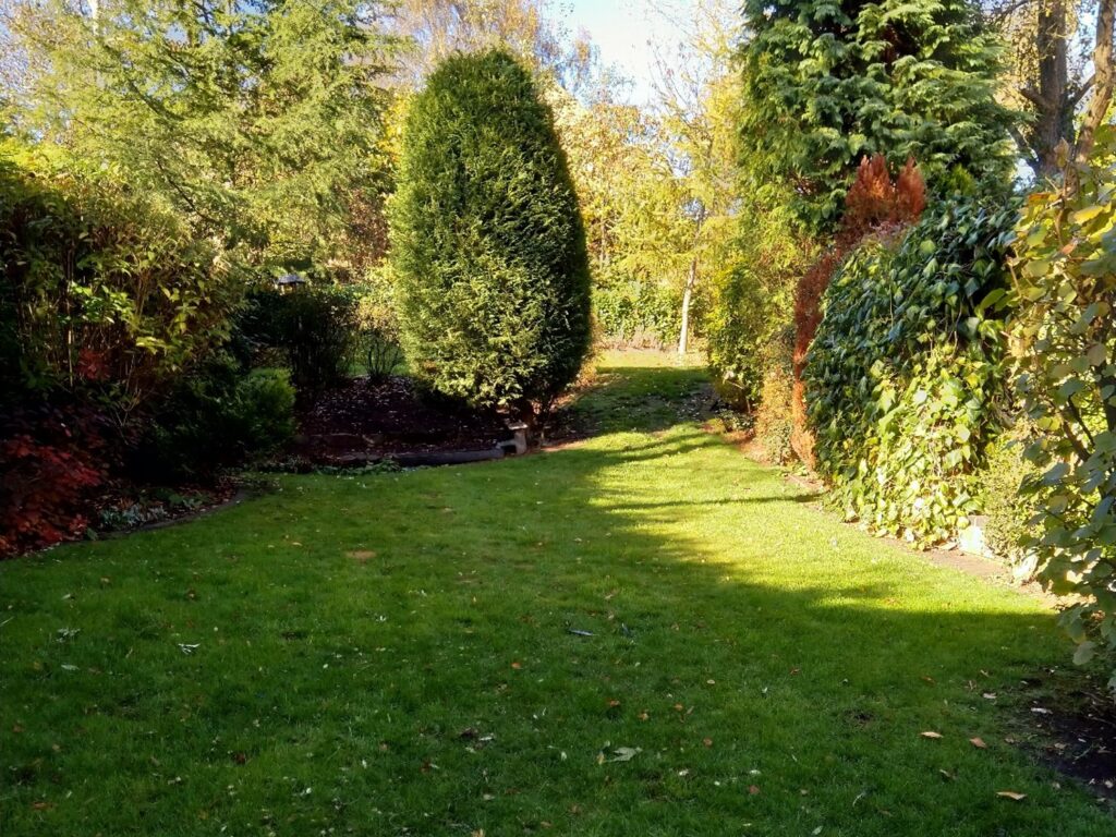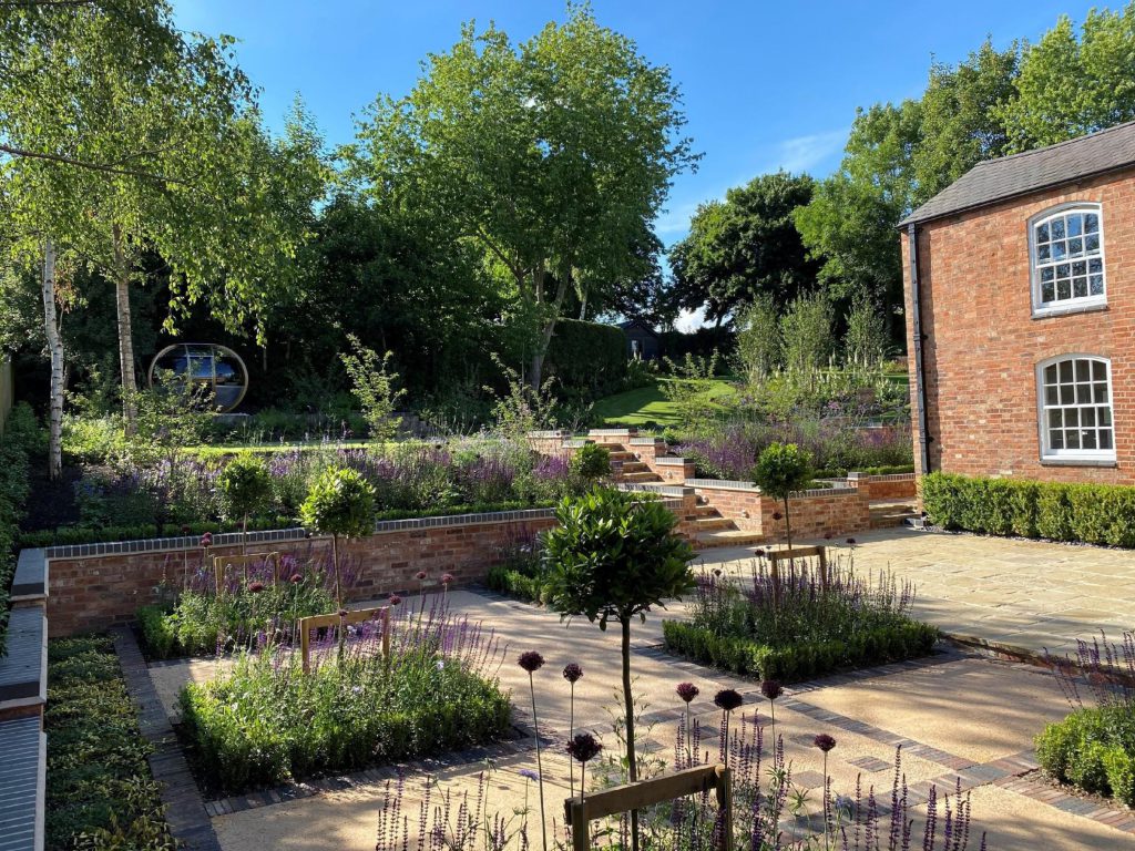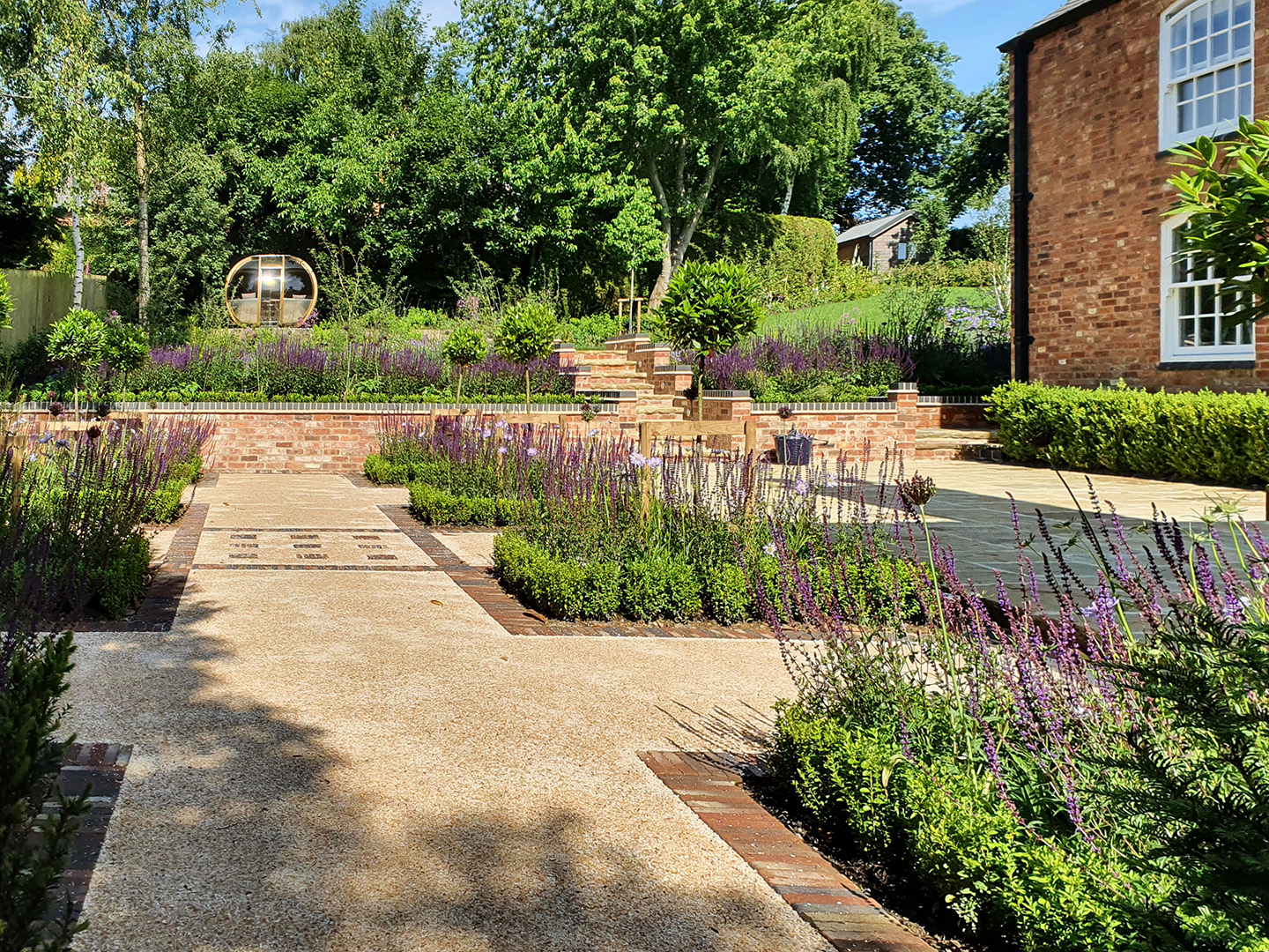 This fabulous parterre design, with neat Buxus hedging and Bay tree standards, replaced a tired sloping lawn, an old neglected pond and a mishmash of conifers, overgrown shrubbery and ivy laden trellises, which enclosed the old concrete slabbed patio. The newly laid Old Yorkstone patio and reclaimed brick retaining walls are now much more in keeping with this beautiful Georgian country house.